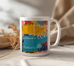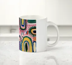 Un patchwork di motivi diversi, tra cui linee e forme a U, nei vivaci colori giallo, blu, rosa e rosso, crea un colorato effetto mosaico in questo pezzo astratto.
