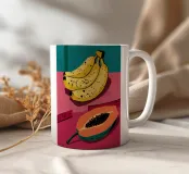 Un'illustrazione audace e ispirata alla pop art di banane e papaya su un piatto rosso brillante. I colori ad alto contrasto e lo stile grafico creano una dichiarazione vibrante e giocosa.