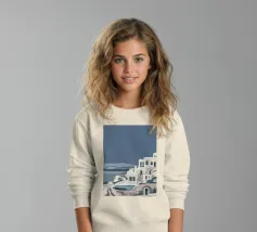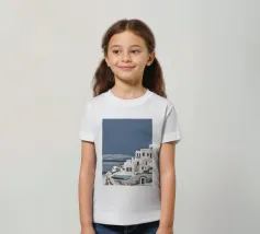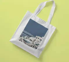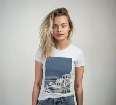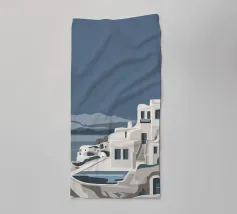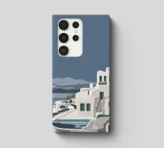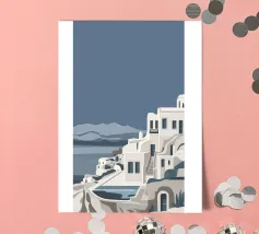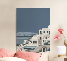 Una rappresentazione minimalista dell'iconica architettura imbiancata di Santorini, in Grecia, sotto un cielo calmo e crepuscolare, che trasmette un profondo senso di pace, tranquillità e bellezza senza tempo.