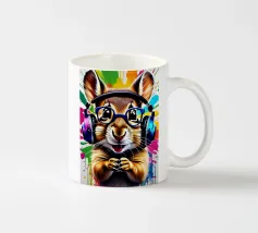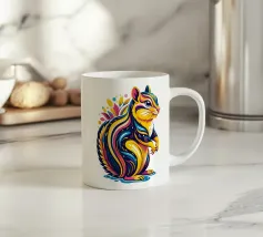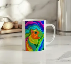 Uno scoiattolo curioso si affaccia vivacemente dal quadro, raffigurato con colori intensi e brillanti su uno sfondo nero. La tavolozza dei colori spazia dal blu intenso e dal rosa brillante al giallo caldo e al rosso vibrante. I passaggi sono fluidi e ricordano le pennellate, mentre singoli schizzi e gocce di colore conferiscono al motivo un effetto dinamico, quasi esplosivo. L'animale appare vigile e vivace, con dettagli finemente lavorati nella sua pelliccia e un grande occhio lucido che guarda direttamente lo spettatore.