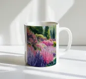 Un prato è pieno di alte guglie di fiori di lupino rosa e viola, le cui forme morbide e verticali creano un paesaggio romantico e sognante che sembra rigoglioso e pieno di vita.