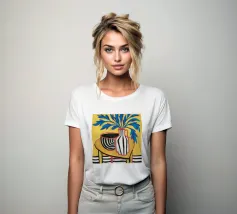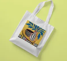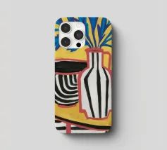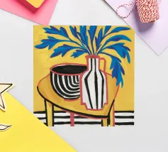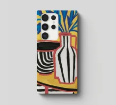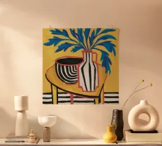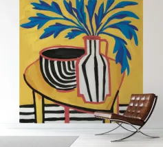 Una suggestiva natura morta con fogliame blu in un audace vaso a righe bianche e nere, accompagnato da una tazza più piccola a righe. La composizione è collocata su un vivace sfondo giallo, creando un effetto visivo di grande impatto.