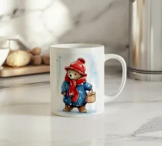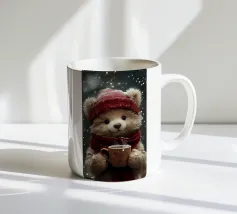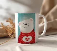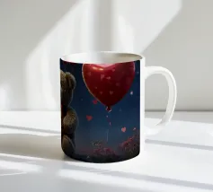 Un simpatico orsacchiotto vestito con un'accogliente felpa con cappuccio siede nella neve, tenendo gioiosamente un cuore rosso mentre un palloncino si muove nell'aria fresca della sera sotto un tramonto colorato.