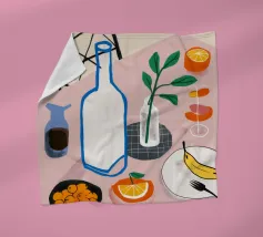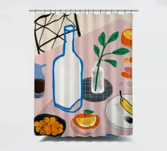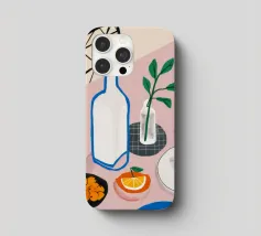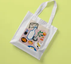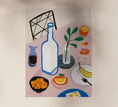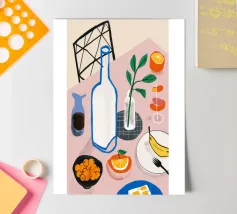 Una classica natura morta con una bottiglia di vino, un bicchiere, formaggio e frutta su un tavolo rotondo, parzialmente in ombra. La composizione è elegante e sofisticata, con una qualità pittorica senza tempo.