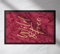 Citazione scritta a mano semplicemente "Wild & Free" su sfondo in grassetto di foglie tropicali.