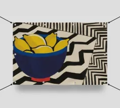 Una natura morta audace e grafica di una ciotola blu riempita di limoni gialli, su un motivo a zig zag in bianco e nero ad alto contrasto. L'immagine è energica, moderna e ha una forte impronta pop art.