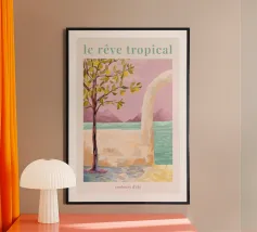Un'illustrazione tropicale in un ambiente mediterraneo. La panchina invita a sognare in questo ambiente estivo.