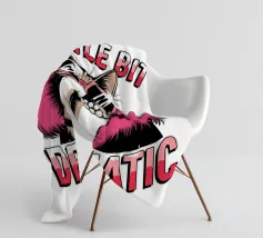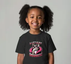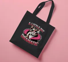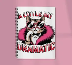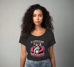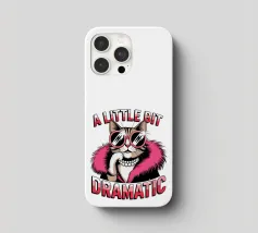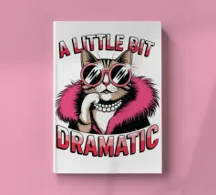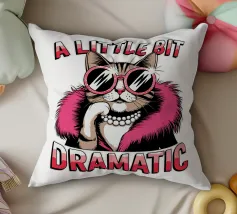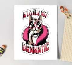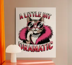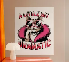 Un gatto vestito in modo glamour, con occhiali da sole oversize, una pelliccia rosa e una collana di perle, emana sicurezza. La frase "A Little Bit Dramatic" è ben visibile sul gatto.