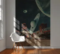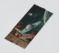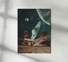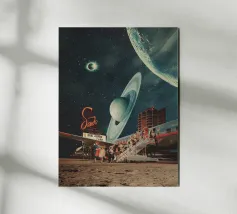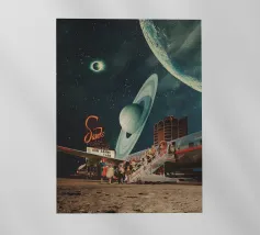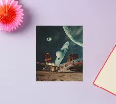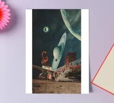 "Spero che questa cartolina vi trovi bene. Ci stiamo divertendo molto. Non preoccuparti, torneremo presto con nuovi ricordi". ~ un tentativo per una nuova cartolina di viaggio surreale retro futuristica con aereo per nuovi pianeti.