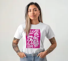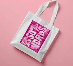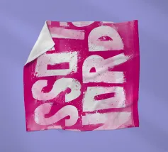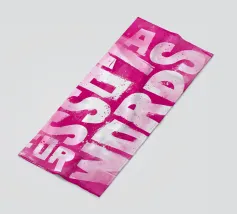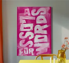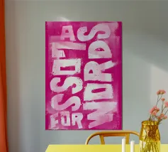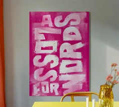 "La frase 'A SET OF WORDS' è disposta verticalmente in caratteri bianchi e afflitti su uno sfondo rosa vibrante, con schizzi e texture che creano un senso di emozione grezza e di espressione artistica",