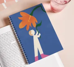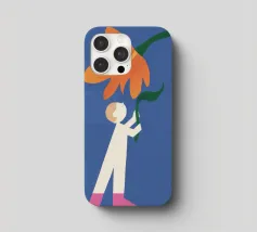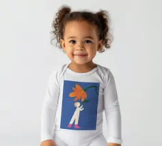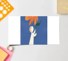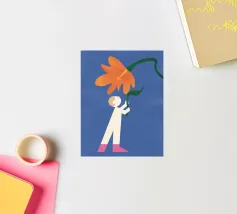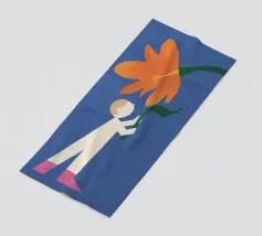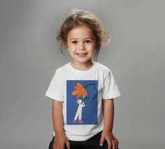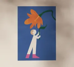 Su uno sfondo blu intenso, una figura in un semplice abito bianco regge delicatamente lo stelo di un gigantesco e vibrante fiore arancione, simboleggiando un legame con la grandezza della natura.