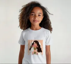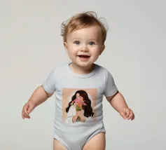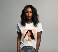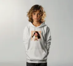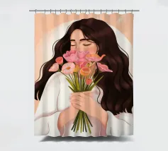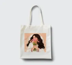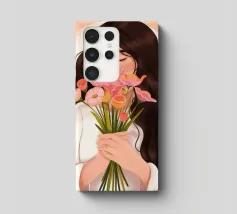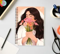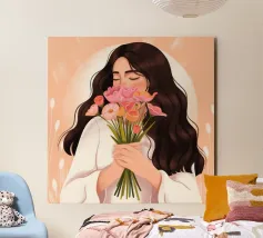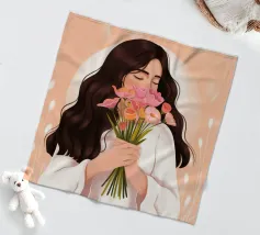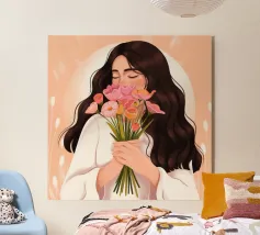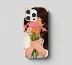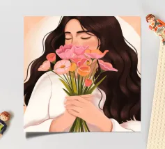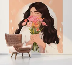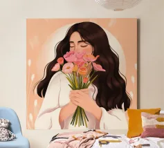 Una persona con lunghi capelli castano scuro che tiene vicino al petto un bouquet di fiori rosa. Lo sfondo è di un tenue color pesca, che completa il dolce e tenero abbraccio dei fiori.