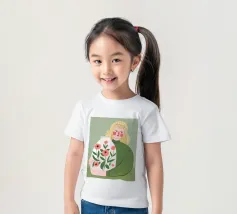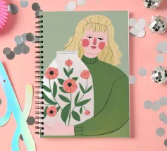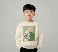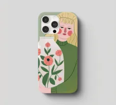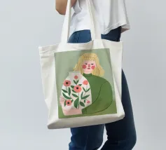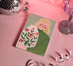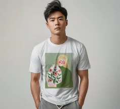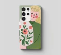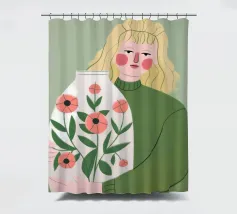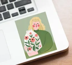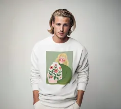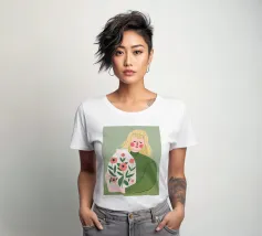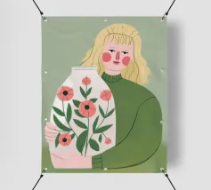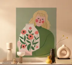 Questo dipinto mostra una persona che tiene in mano un grande vaso decorato con fiori. La persona indossa un maglione verde e lo sfondo è di un verde tenue che sottolinea il legame con la natura e la tranquillità.
