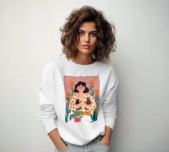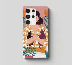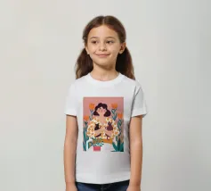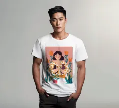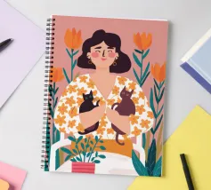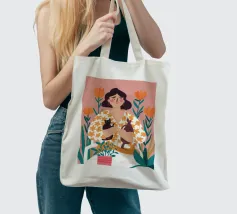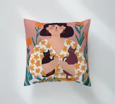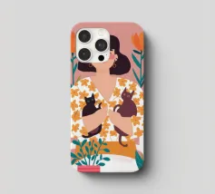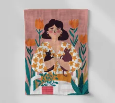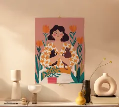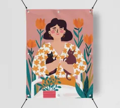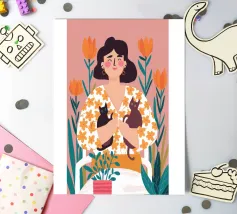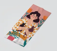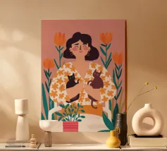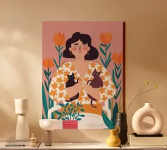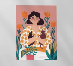 Una commovente illustrazione di una donna che abbraccia dolcemente un piccolo e soffice cane, circondata da una cornice di bellissimi fiori colorati.