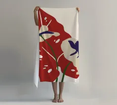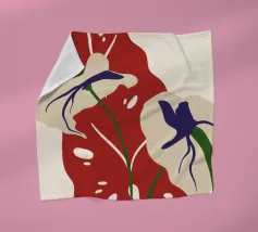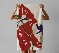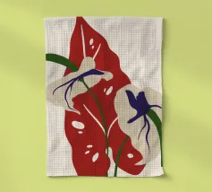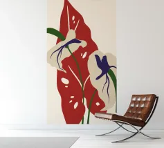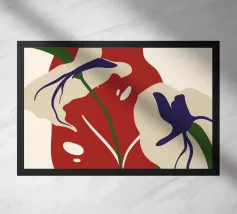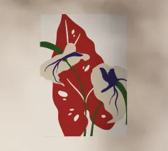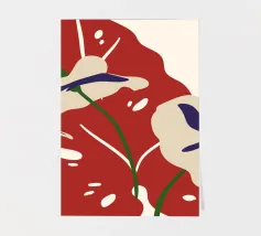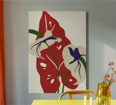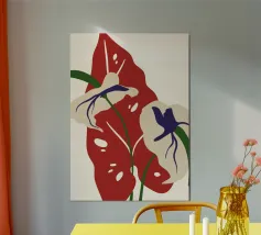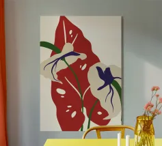 Questa accattivante opera d'arte astratta presenta un'armoniosa miscela di audaci elementi botanici e design minimalista. Caratterizzata da vivaci tonalità di rosso, crema e verde intenso, le foglie stilizzate e le forme organiche creano una composizione dinamica che celebra la bellezza della natura. Perfetto per gli interni moderni, questo pezzo evoca un senso di tranquillità e raffinatezza, aggiungendo un tocco artistico e vivace a qualsiasi spazio.