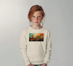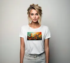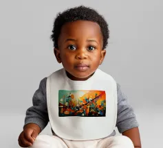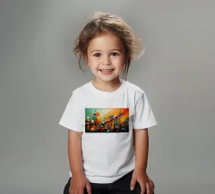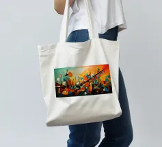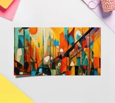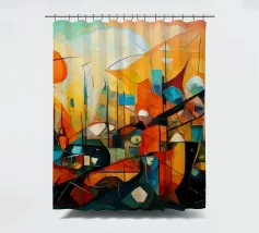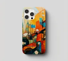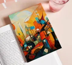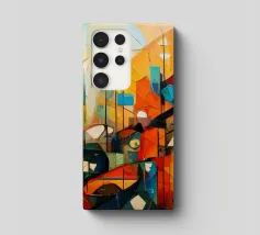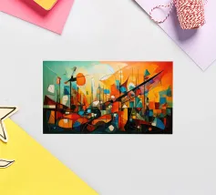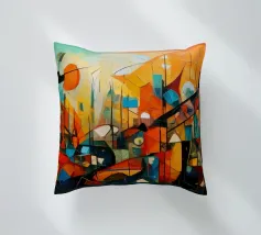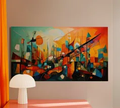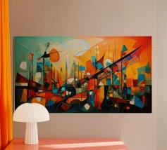 Un dipinto astratto dinamico che rappresenta un paesaggio urbano con forme geometriche audaci, colori caldi e vibranti e contrasti sorprendenti. La composizione presenta motivi stratificati, linee angolari e forme sovrapposte, creando un senso di profondità e movimento su uno sfondo sfumato.