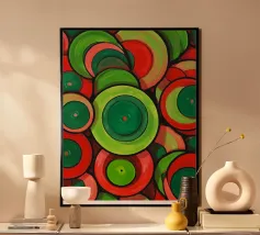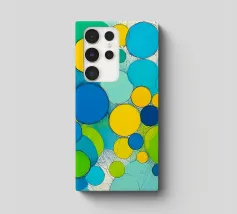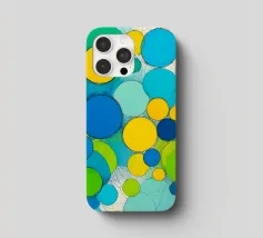 Quest'opera astratta presenta una vivace composizione di numerosi cerchi di diverse dimensioni. La tavolozza dei colori è dominata da un giallo brillante, un blu intenso e un fresco verde lime, completati da toni più chiari di turchese e ciano. I cerchi si sovrappongono parzialmente, creando una certa profondità e trasparenza. Lo sfondo è luminoso e infuso di spruzzi di colore dinamici e linee sottili e veloci che aggiungono una texture vivace ed energica. L'immagine emana un'allegria giocosa e moderna.