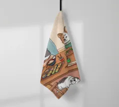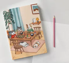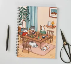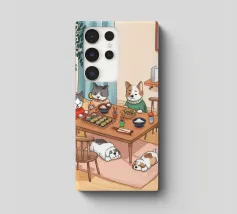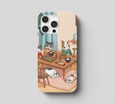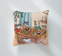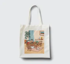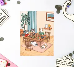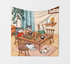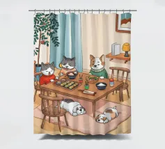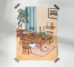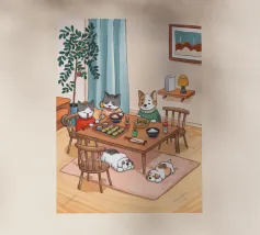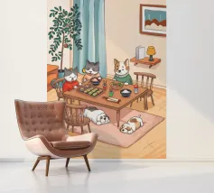Questo dipinto raffigura una calda scena interna con tre gatti seduti intorno a un tavolo da pranzo, che si godono il pasto. Altri due gatti dormono sul pavimento, circondati da luci soffuse, una pianta e una finestra con eleganti tende. L'ambiente irradia compagnia e comfort.