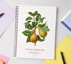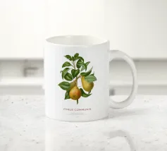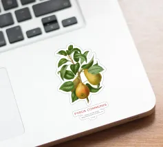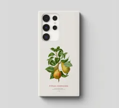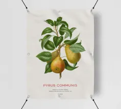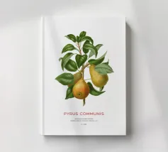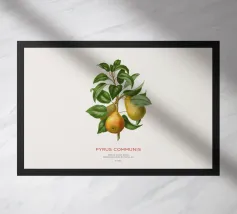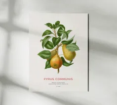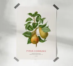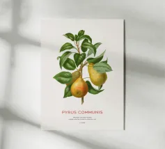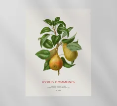Questa squisita arte botanica della pera Saint Louis (Pyrus communis) cattura la delicata bellezza delle varietà di frutta antiche.