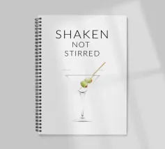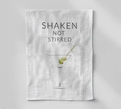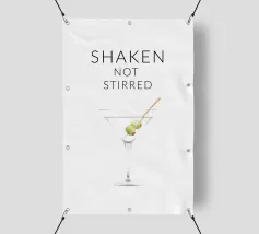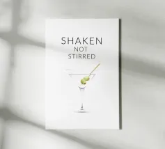 Questo disegno raffigura un bicchiere da martini stilizzato. Il bicchiere contiene un martini chiaro con due olive verdi su uno spiedino. Sopra il bicchiere, il testo Shaken not stirred è scritto a caratteri cubitali. Un sottile cenno allo stile e alla raffinatezza.