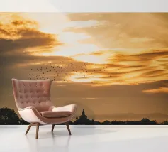 Alba su Dresda con uno stormo di uccelli nel cielo. Sullo sfondo, la torre della televisione scompare nella nebbia, mentre i tetti del centro storico risplendono nella luce calda. Un motivo cittadino tranquillo con un'atmosfera mattutina e colori dorati.