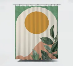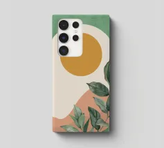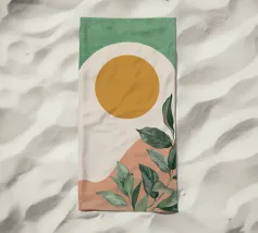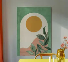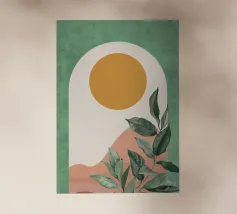 Un'opera d'arte sognante di ispirazione boho con un elegante arco che incornicia montagne mistiche, fogliame estetico e una luna luminosa. I toni della terra e le forme organiche creano un'atmosfera rilassante e libera.