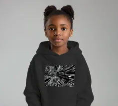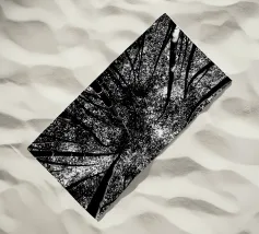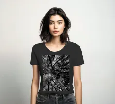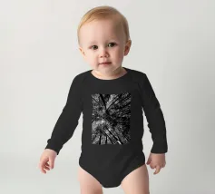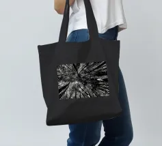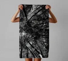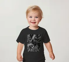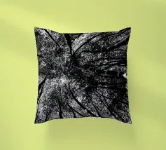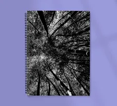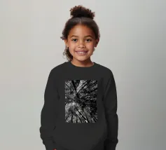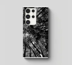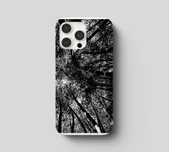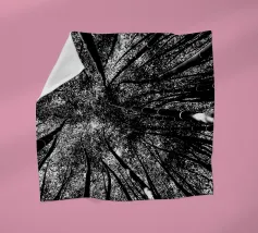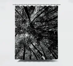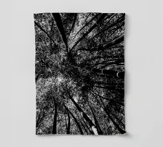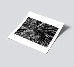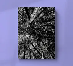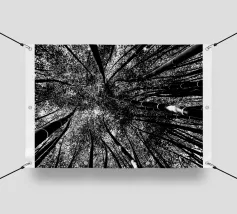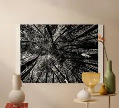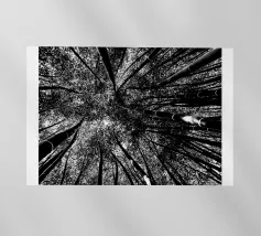 Vista in bianco e nero dal basso di una foresta di alberi molto alti.
