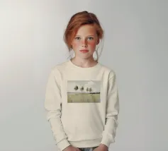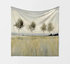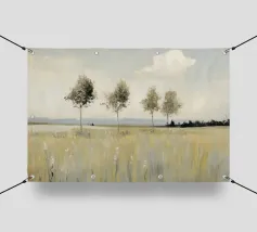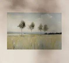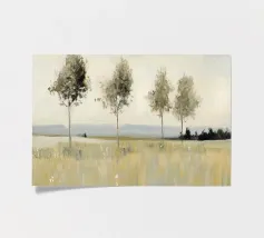 Paesaggio tranquillo con quattro alberi in fila che si ergono in un campo di erba alta e chiara sotto un cielo limpido con poche nuvole. La tavolozza di colori tenui e sfumati contribuisce a creare un'atmosfera calma e pacifica.