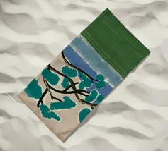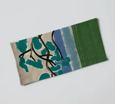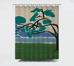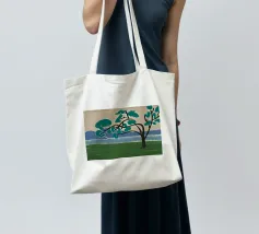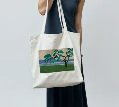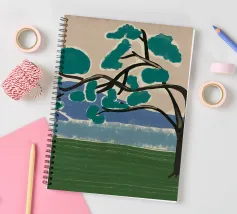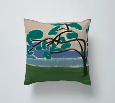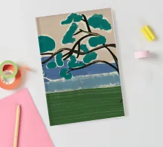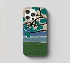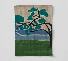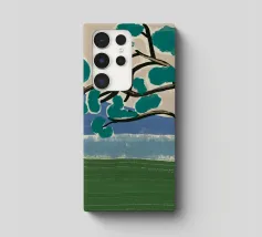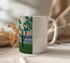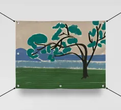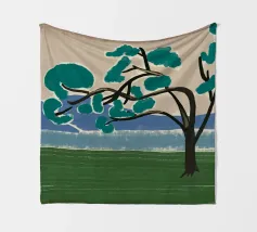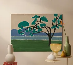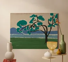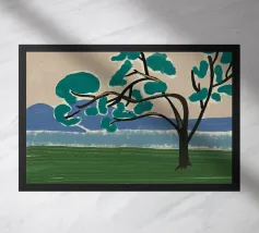 Un albero solitario con ampie foglie verdi si staglia in primo piano su uno sfondo con sfumature di blu, che suggerisce colline o montagne lontane. Il campo è di un verde intenso, con pennellate visibili dappertutto, e il cielo ha una tonalità beige, che conferisce alla scena una qualità semplicistica, quasi infantile.