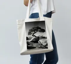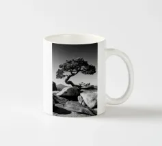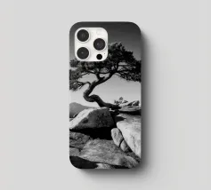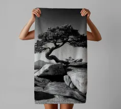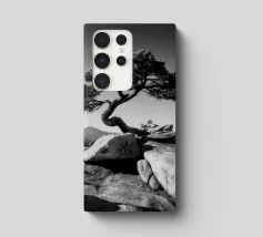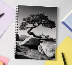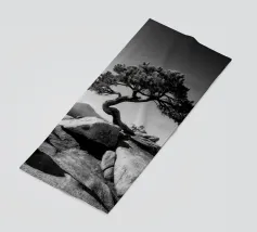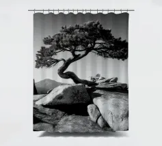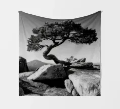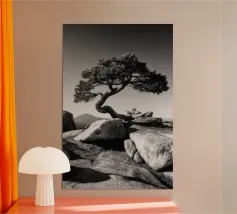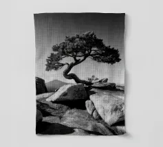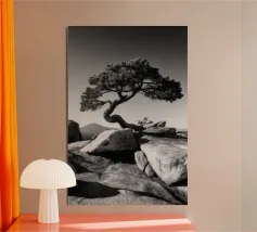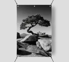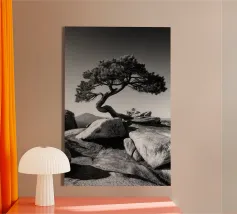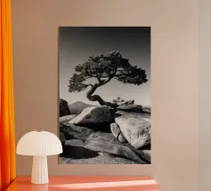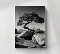 Fotografia di paesaggio, questa suggestiva opera d'arte in bianco e nero presenta un albero resistente in cima a una montagna.