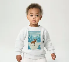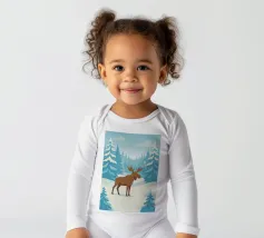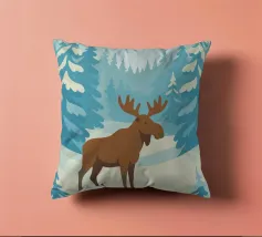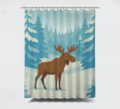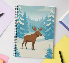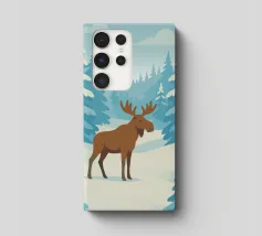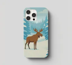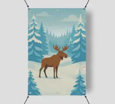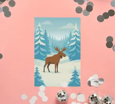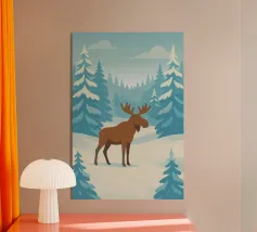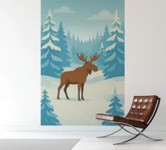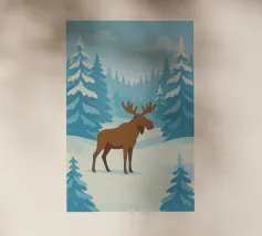 Design minimalista con un alce in una foresta di conifere con abeti o abeti rossi coperti di neve. Design decorativo invernale con un tipico animale selvatico scandinavo, originario tra l'altro di Svezia, Norvegia e Finlandia.