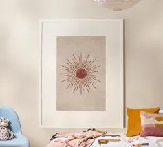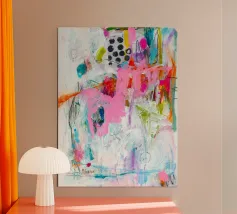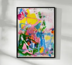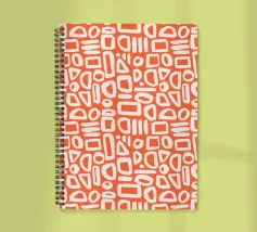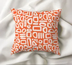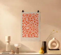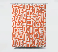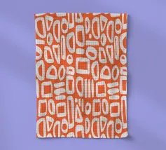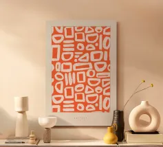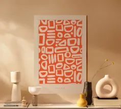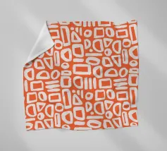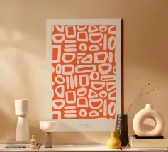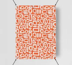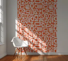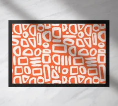 Questo motivo astratto presenta forme geometriche irregolari disegnate a mano in bianco, su uno sfondo arancione. Il disegno è composto da rettangoli, cerchi, triangoli e ovali, che conferiscono alla composizione un'atmosfera giocosa e moderna. Il contrasto tra le forme bianche e il vivace sfondo arancione crea un effetto visivo di grande impatto, perfetto per l'arredamento contemporaneo, il design di tessuti o il branding artistico. Lo stile organico e libero delle forme evoca creatività e spontaneità, rendendo questo motivo ideale per spazi dinamici e di design.