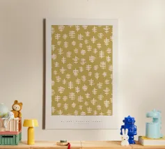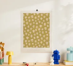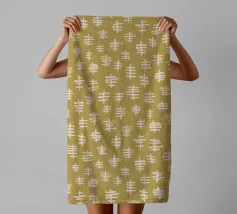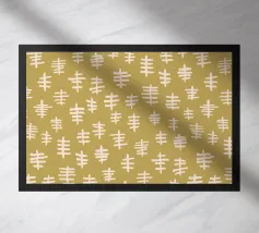 Questa immagine presenta uno sfondo giallo senape decorato con un motivo astratto di linee bianche irregolari orizzontali che formano una forma stilizzata simile a un albero o a un ramo. Il disegno minimalista si ripete uniformemente sulla superficie, creando un senso di ritmo e movimento. Le forme semplici e pulite contribuiscono a creare un'estetica moderna e artistica adatta a carta da parati, tessuti o design digitale.