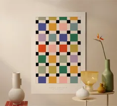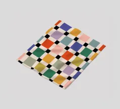 Motivo a quadri colorati con una griglia di quadrati luminosi nei toni dell'arancione, del blu, del verde, del viola e del giallo. Ogni quadrato è delimitato da linee nere irregolari che creano un disegno giocoso e artistico. Lo sfondo è di un morbido colore bianco sporco, che conferisce al motivo un aspetto moderno e allegro. Questo disegno è ideale per l'utilizzo in tessuti, carte da parati o sfondi digitali, aggiungendo un tocco di audacia e creatività.