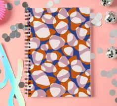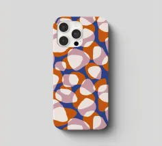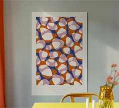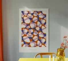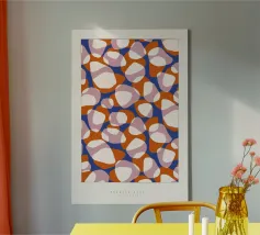 Motivo astratto con forme organiche simili a ciottoli di varie dimensioni. Il disegno presenta elementi stratificati nei toni dell'arancio, del rosa e del crema su uno sfondo blu intenso. Le forme sovrapposte creano un aspetto dinamico e fluido che ricorda le pietre naturali o l'arte astratta. Questo motivo è perfetto per tessuti, carta da parati o arte digitale, con la sua palette di colori vivaci e la composizione fluida che crea un'estetica audace e moderna.