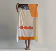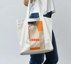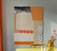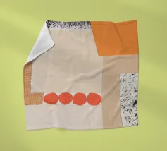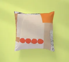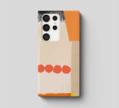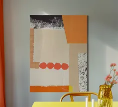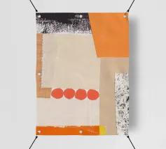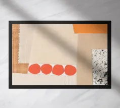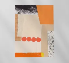 Questa immagine è un collage a tecnica mista con una miscela di pezzi di carta testurizzata nei toni dell'arancione, del crema, del beige e del nero. Il collage è composto da diversi strati, tra cui carta con motivi a griglia, bordi strappati e una sezione con una stampa nera strutturata che ricorda le pennellate o le macchie d'inchiostro. Una serie di quattro forme circolari rosso-arancio disposte in fila aggiunge un accento audace e giocoso alla composizione. Nell'angolo in alto a destra si trova una forma di colore arancione brillante.