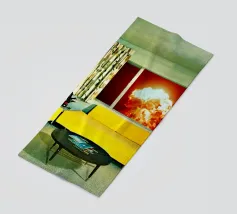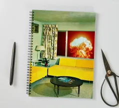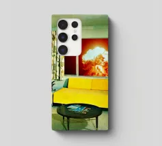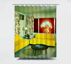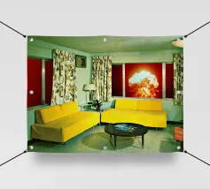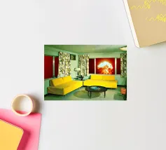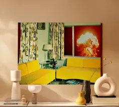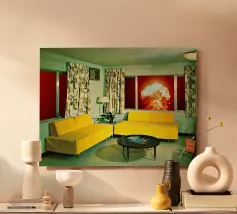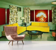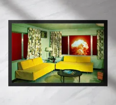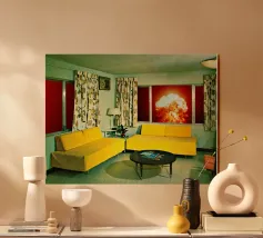 Grazioso soggiorno di metà secolo con divani gialli e un'esplosione sullo sfondo. Collage sulla fine del mondo di MsGonzalez