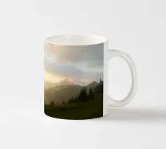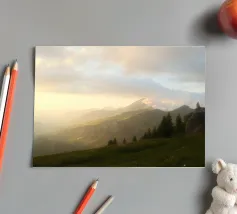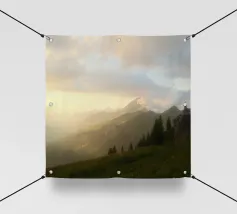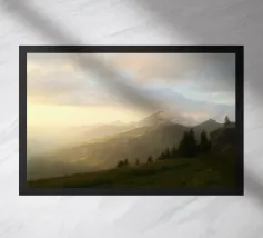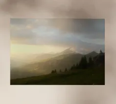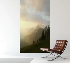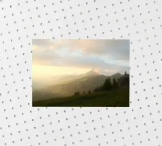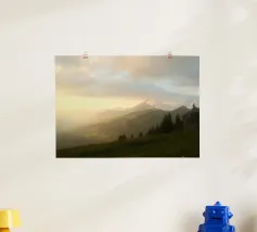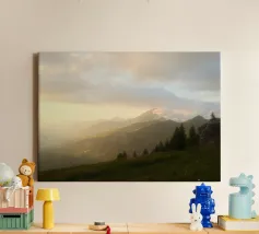 Il cielo si accende di sfumature dorate e ambrate mentre il sole tramonta su tranquilli prati alpini. Quest'opera d'arte cattura la bellezza fugace del crepuscolo in montagna, riempiendo il vostro spazio di calore e serenità.