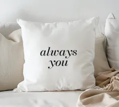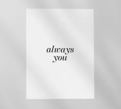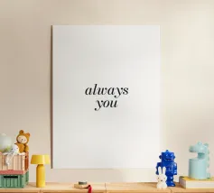 Questo disegno tipografico semplice e moderno con il messaggio d'amore "Always You" irradia pura eleganza e romanticismo senza tempo. Il carattere fine ed elegante su uno sfondo neutro lo rende perfetto per murales, cuscini o altri accessori per la casa. Ideale per gli amanti del design minimalista e dei messaggi romantici, quest'opera d'arte porta una dichiarazione sottile ma significativa in ogni casa. Perfetto come regalo o per la propria casa per creare un'atmosfera speciale.