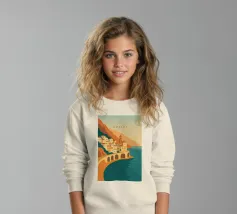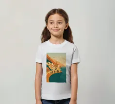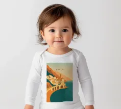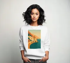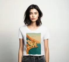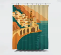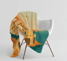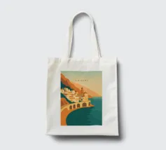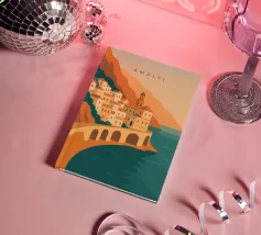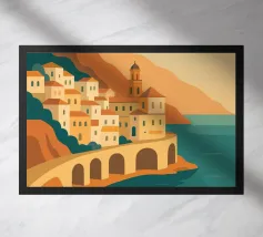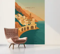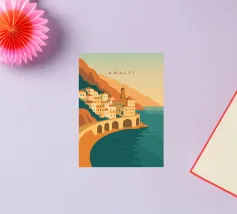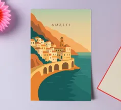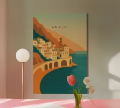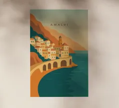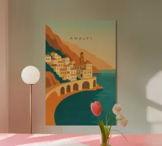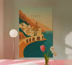 Poster di viaggio minimalista per tutti coloro che amano la piccola città di Amalfi con il suo impressionante paesaggio sotto le ripide scogliere della costa sud-occidentale dell'Italia. Design decorativo per le vacanze estive per tutti gli amanti dell'Italia e i viaggiatori del Mediterraneo.