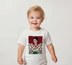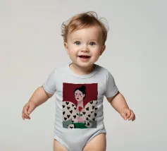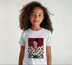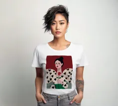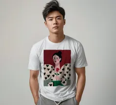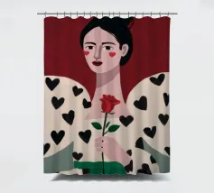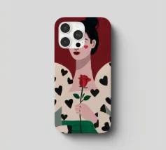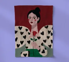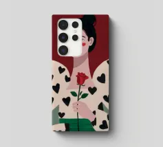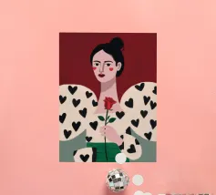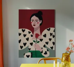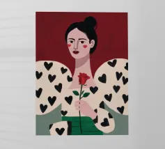 Un bellissimo ritratto di donna con rossetto rosso, che tiene in mano una singola rosa e indossa una giacca chic con un motivo a cuori neri, simbolo di un amore moderno e autopropulsivo.