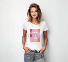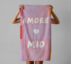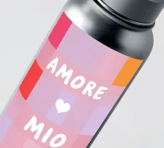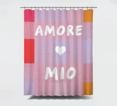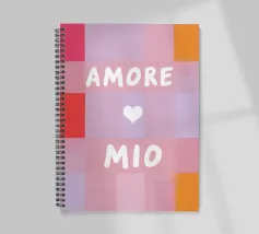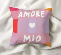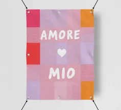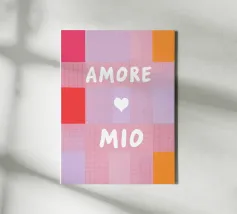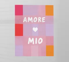 Un poster con testo d'amore con il messaggio scritto a mano "Amore Mio" - forte, chiaro e pieno di emozioni. Le lettere bianche su un motivo a righe e a quadri rosa e arancione ricordano le giornate di sole in Italia. Una moderna dichiarazione d'amore con struttura e cuore.