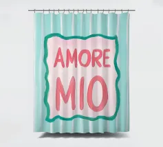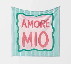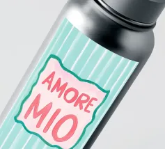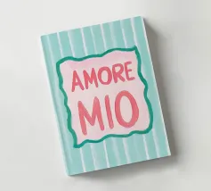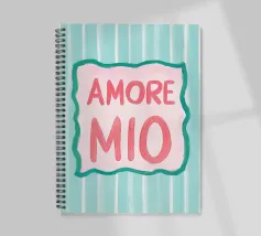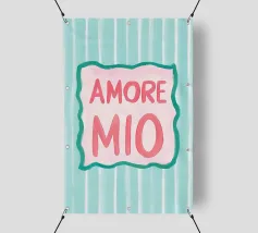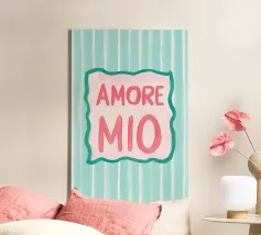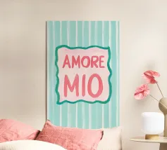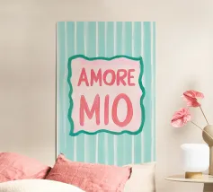 L'illustrazione a righe "Amore Mio" combina lo stile italiano con i colori vivaci del rosa, del bianco e del turchese. Questo moderno poster di testo dal design art déco utilizza grandi caratteri ed elementi grafici per esprimere un allegro romanticismo estivo.