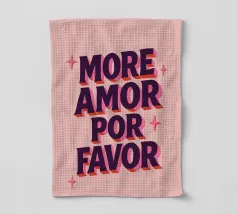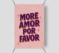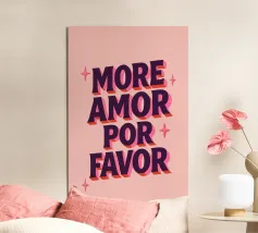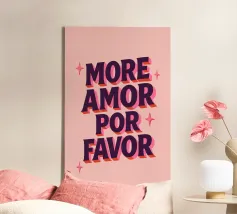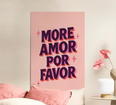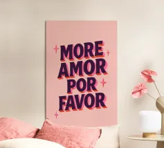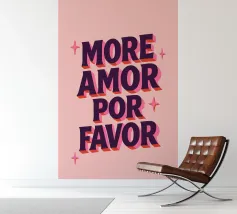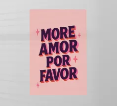 Un affascinante poster tipografico con un messaggio d'amore in spagnolo-inglese: "More Amor Por Favor". Il potente carattere 3D in viola scuro con ombre rosa su uno sfondo rosa pallido porta il buon umore e il romanticismo nella vostra casa. Perfetto per il salotto, la camera da letto o come regalo per la vostra persona preferita - amorevole, colorato e con un messaggio chiaro: più amore, per favore!