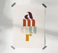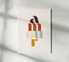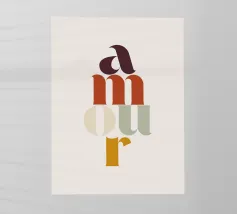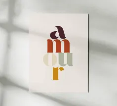 Questo elegante poster presenta la parola "Amour" in grassetto a caratteri retrò su un morbido sfondo beige. I caldi colori vintage e il design a caratteri cubitali gli conferiscono un'atmosfera giocosa e moderna. Perfetto per aggiungere un tocco di fascino a camere da letto, soggiorni, corridoi o pareti di gallerie. Un'ottima scelta per chi ama lo stile retrò, l'arte tipografica o l'arredamento semplice e positivo.