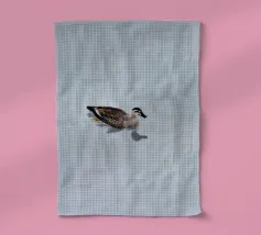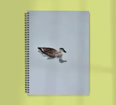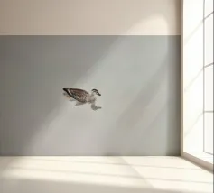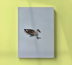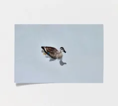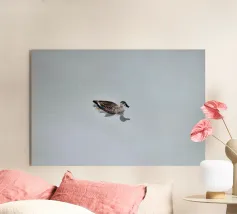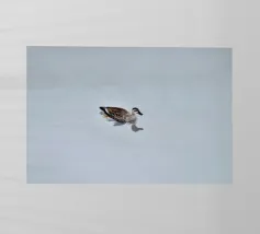 Le dolci increspature si formano intorno al corpo dell'anatra che rema con le zampe palmate, creando morbide onde che si propagano verso l'esterno. L'acqua riflette il cielo e il riflesso dell'anatra si muove al suo fianco, calmo e sereno in questa scena tranquilla".