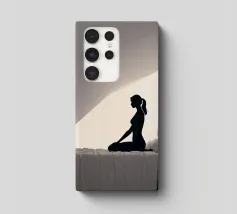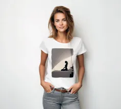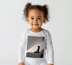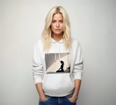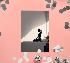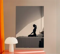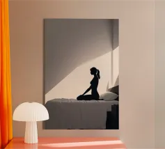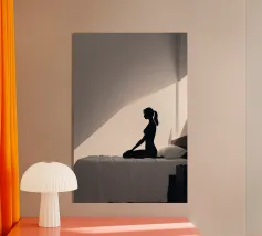 La silhouette calma di una donna seduta tranquillamente sul suo letto mentre la luce del sole filtra dalla finestra. Una riflessione sulle mattine lente, sulla serenità e sull'equilibrio tra luce e riposo.