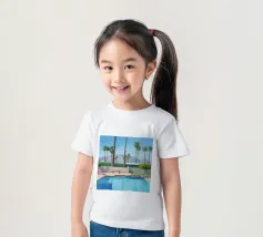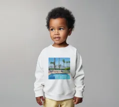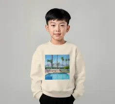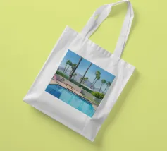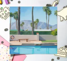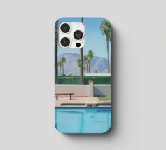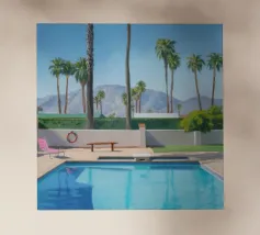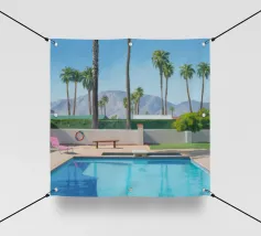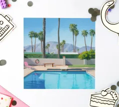 Una piscina con acqua cristallina, un salvagente rosa e palme sullo sfondo, tipica di un resort nel deserto.