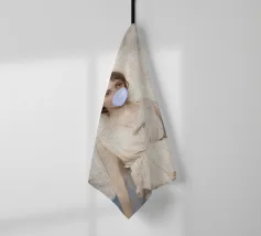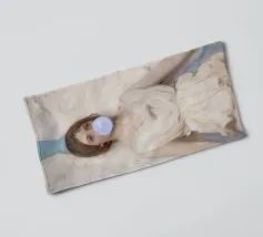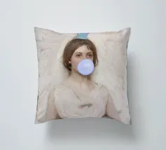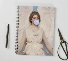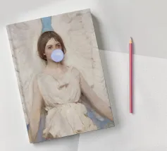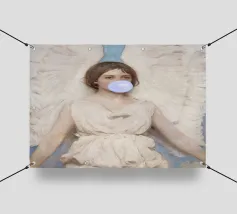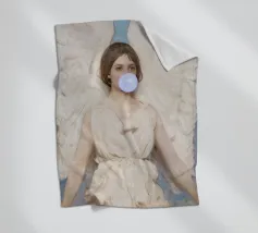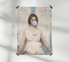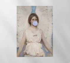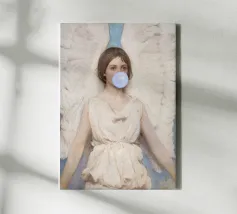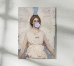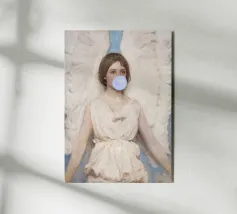 Un ritratto digitale surreale di un angelo moderno che mastica bubble-gum, dove il divino incontra il giocoso nei toni pastello. Questo pezzo pop-art minimalista aggiunge un'irriverenza sfacciata al simbolismo spirituale, rendendolo perfetto per interni audaci e contemporanei.