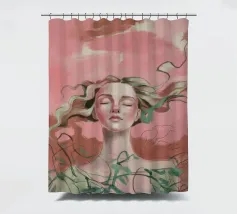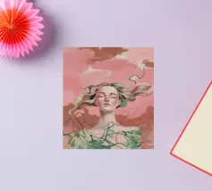 Una rappresentazione eterea e onirica di due volti, forse femminili, apparentemente intrecciati e collegati da nastri o capelli fluenti di colore rosa e verde.